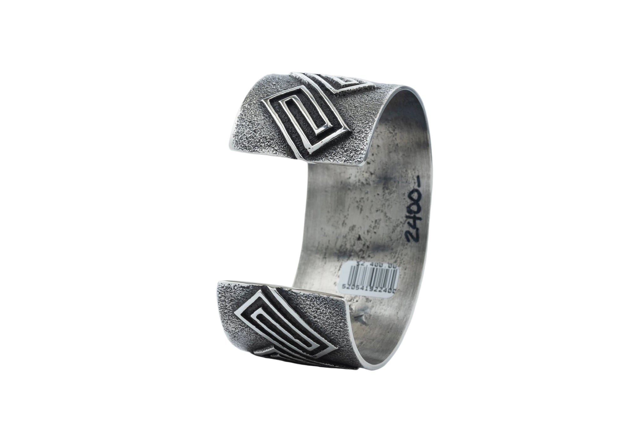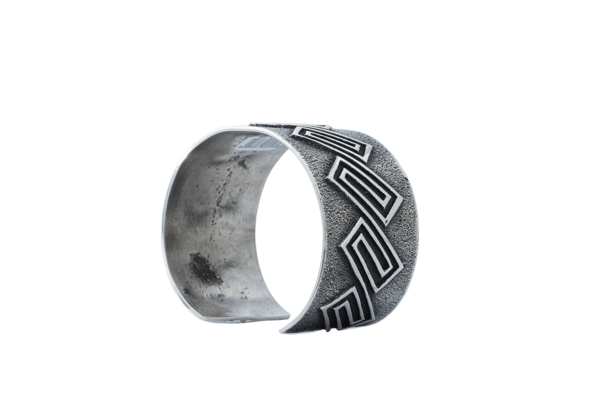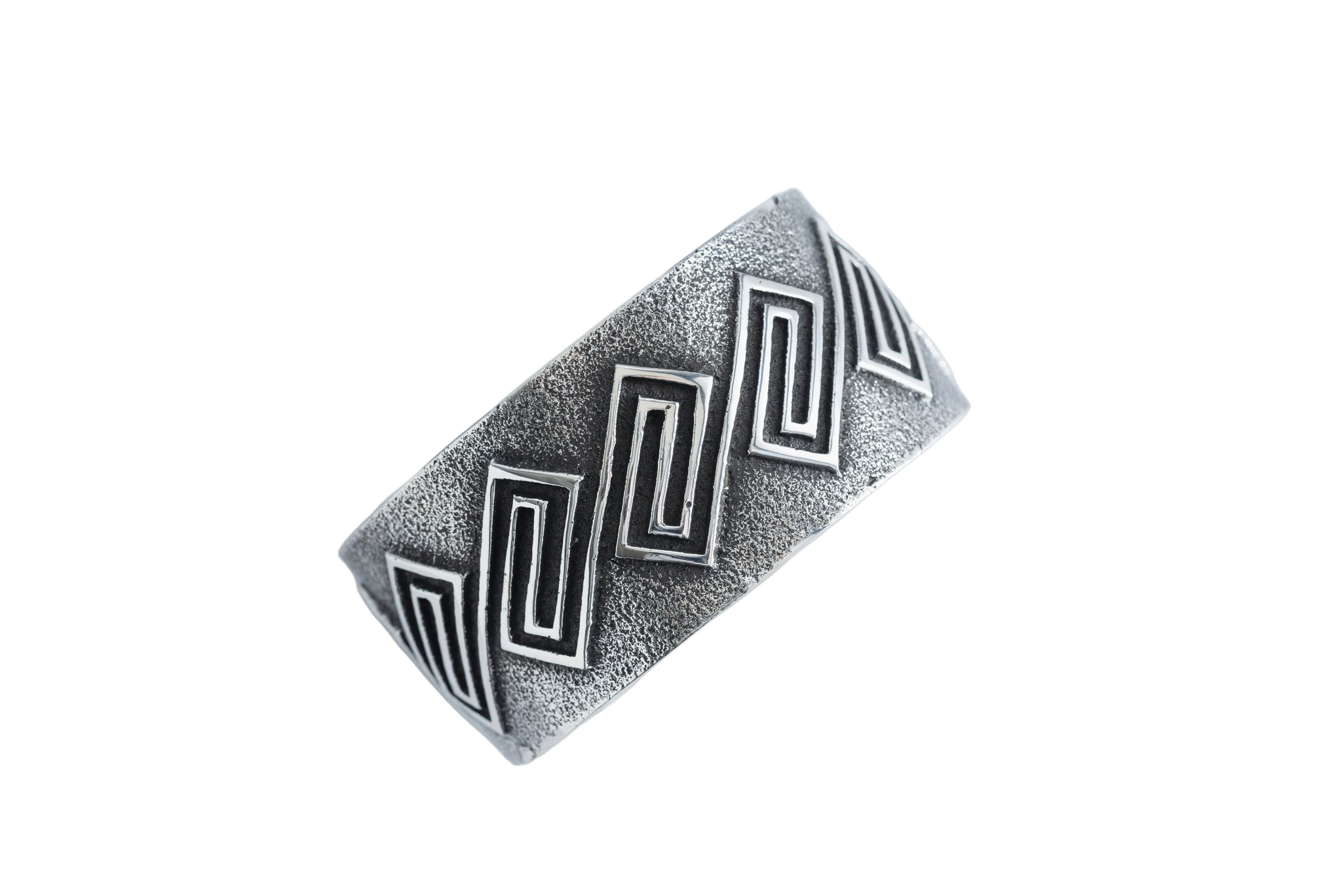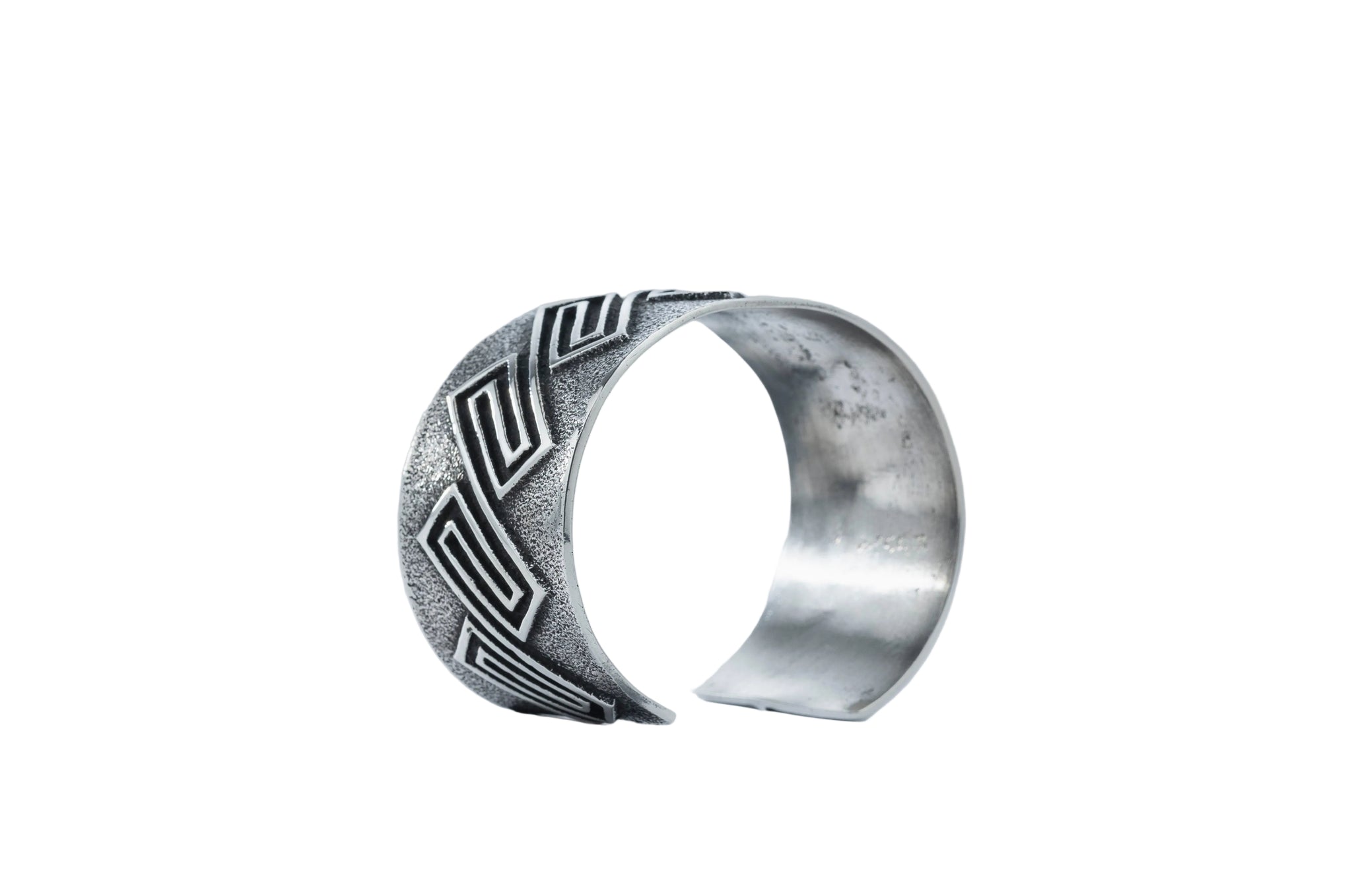 Across the surface sits Anderson’s signature maze-style overlay, built in crisp sterling silver lines that rise above the cast base. The geometric pattern stretches across the band with rhythm and precision, catching light along every edge while the darker tufa texture holds the depth beneath it.