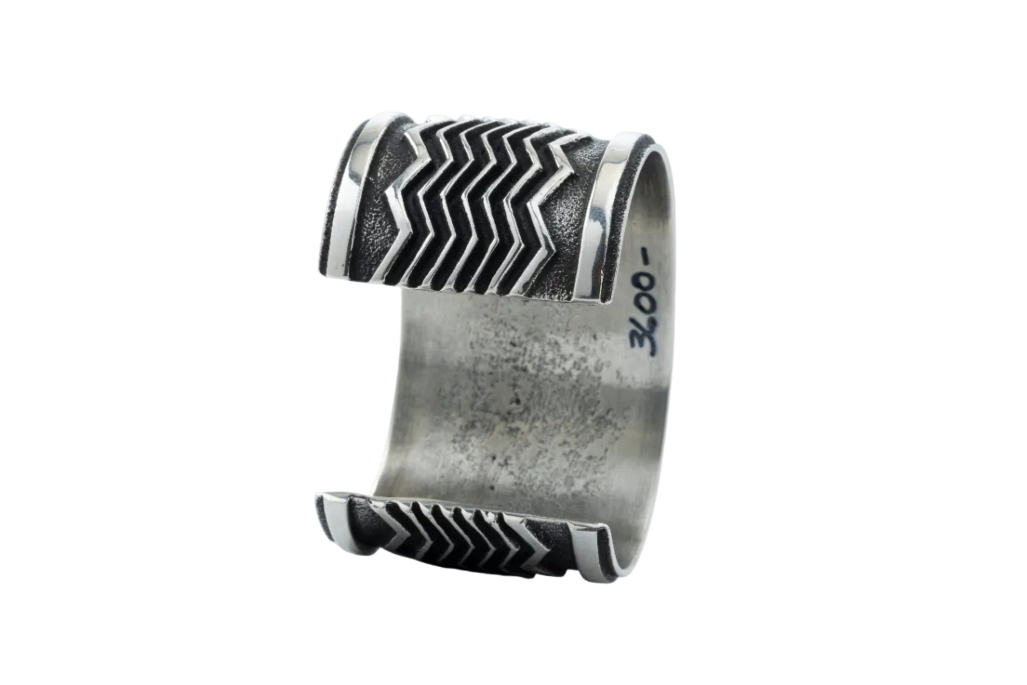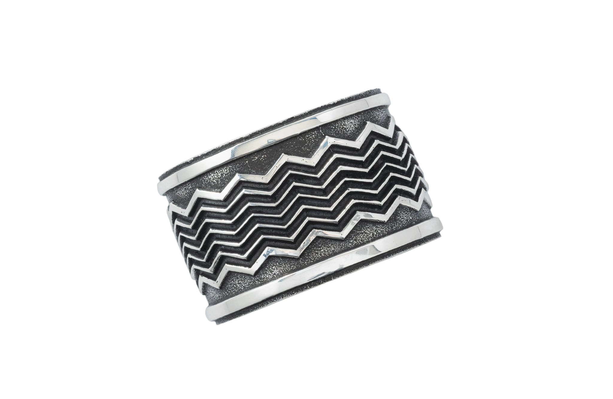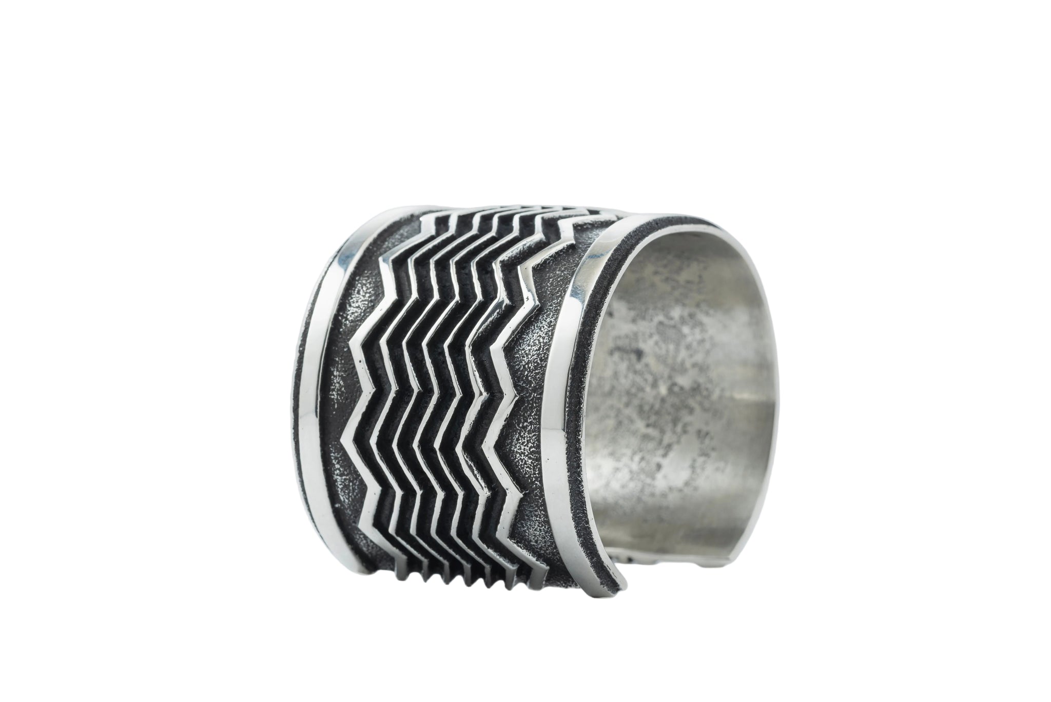 Across the face runs a bold, continuous zigzag maze overlay in high-polish sterling silver. On this wider cuff, the pattern stretches out and settles in — giving the design more rhythm, more presence, more light. It doesn’t just wrap the wrist… it anchors it.