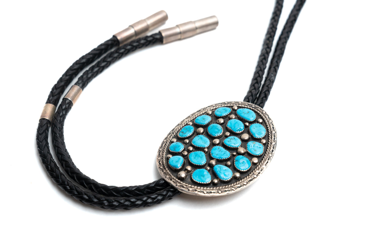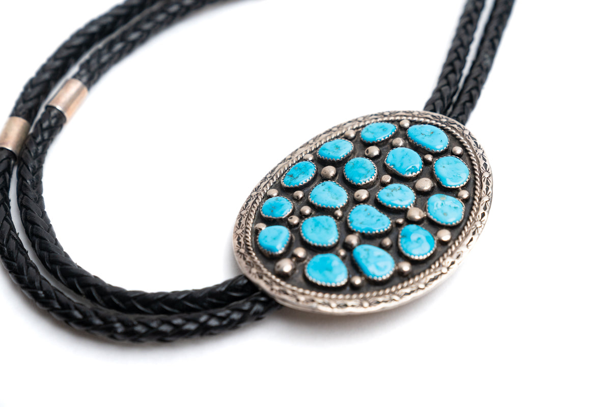 Navajo vintage bolo tie with braided black leather cord and silver tips.