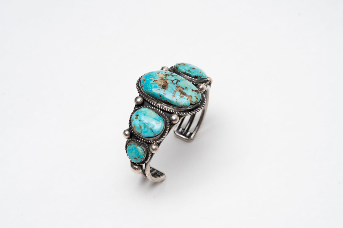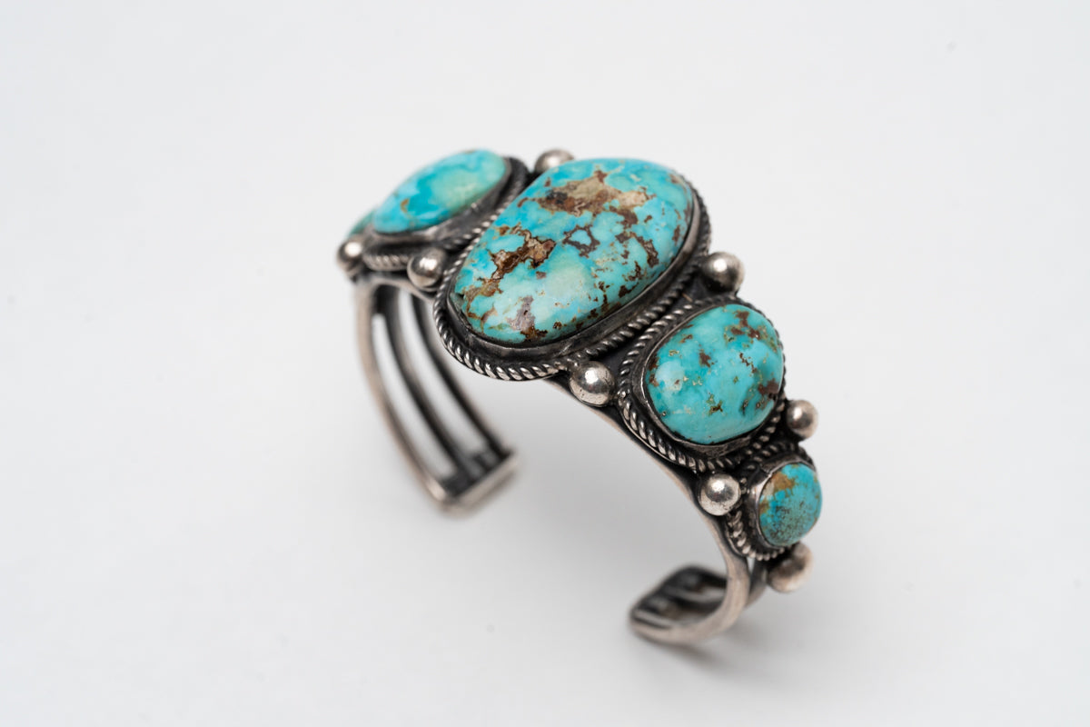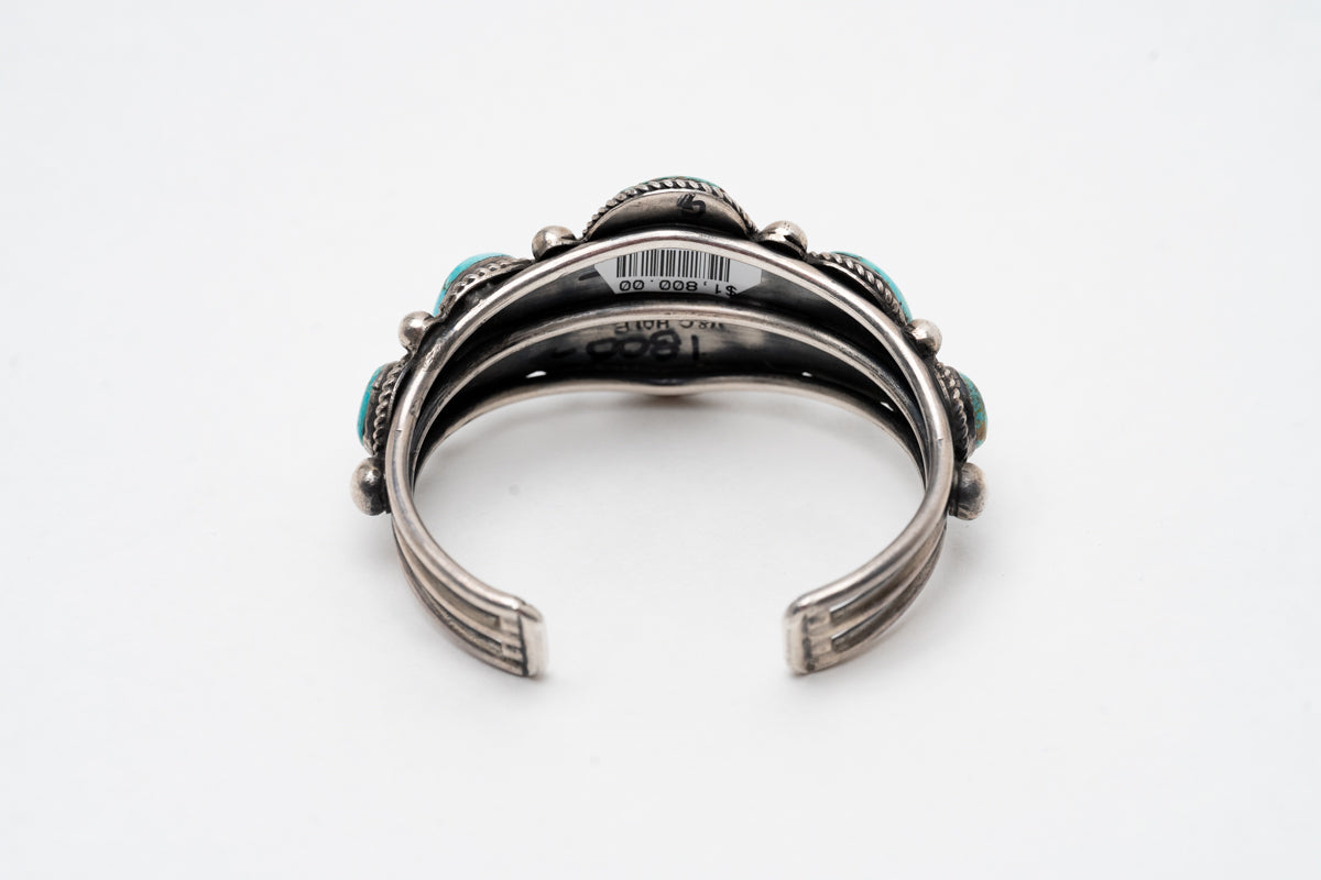 Vernon and Clarissa Hale's designs venture between contemporary and antique style, which can been seen in this beautiful Native American bracelet. The silver work has an oxidized finish mixed with large Royston stones adding to the contemporary and traditional old style blended design.
