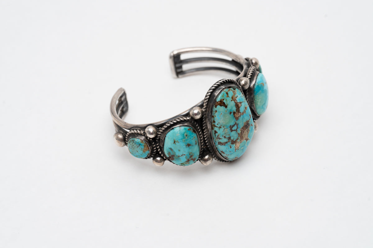 This bracelet is from our vintage collection. The bracelet is signature stamped "V&C Hale." The masters behind this stamp is Vernon and Clarissa Hale. They are a married couple located in Window Rock, AZ, the heart of the Navajo Nation.