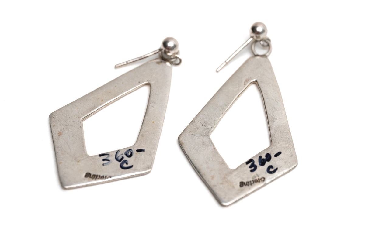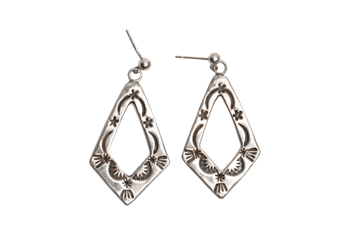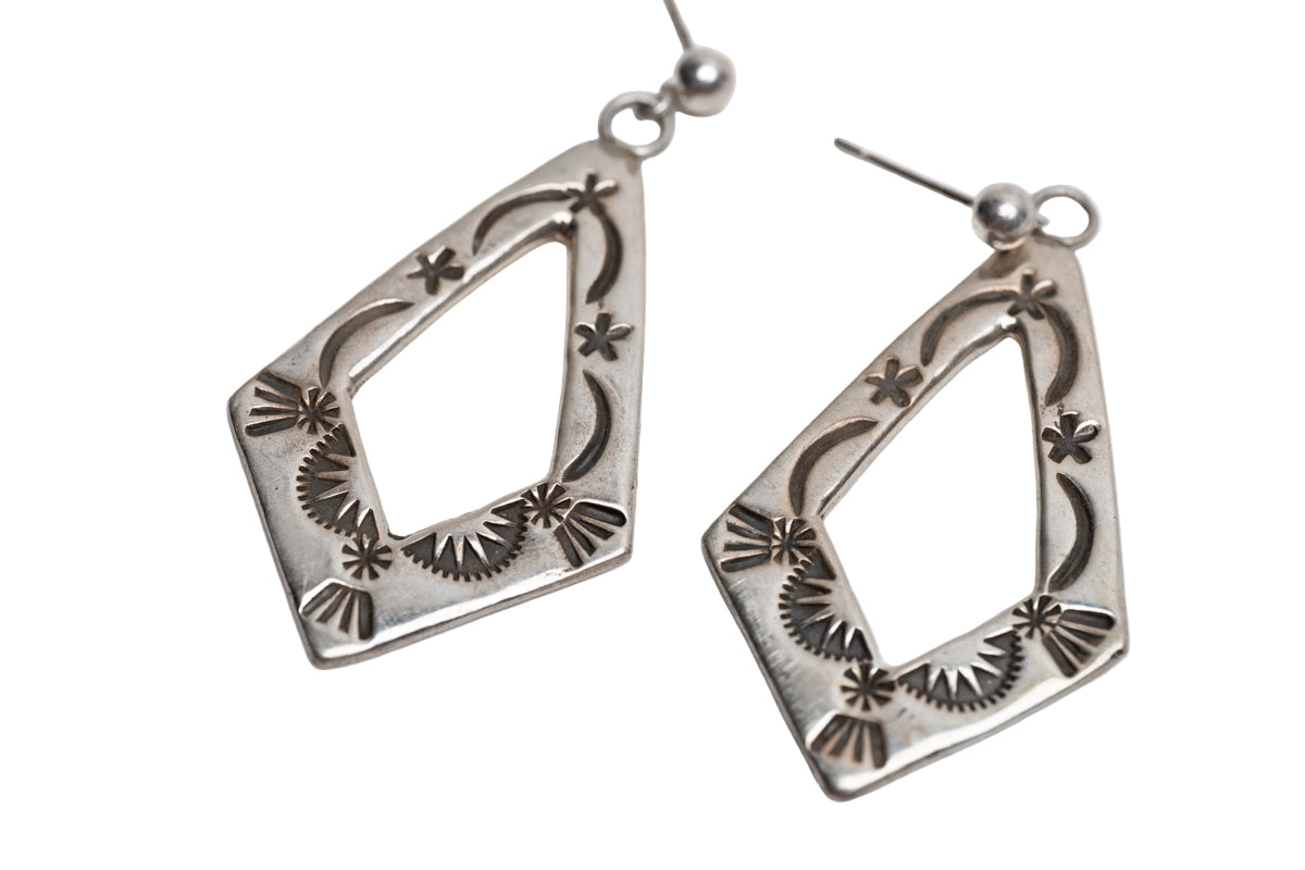 A pair of simple silver earrings that feature a unique diamond-shaped frame with an open center, surrounded with stamps like crescent moons, starbursts, and fan-like details. Lightweight yet eye-catching, their geometric silhouette and artisan texture make them versatile for a night out or board meeting ready.