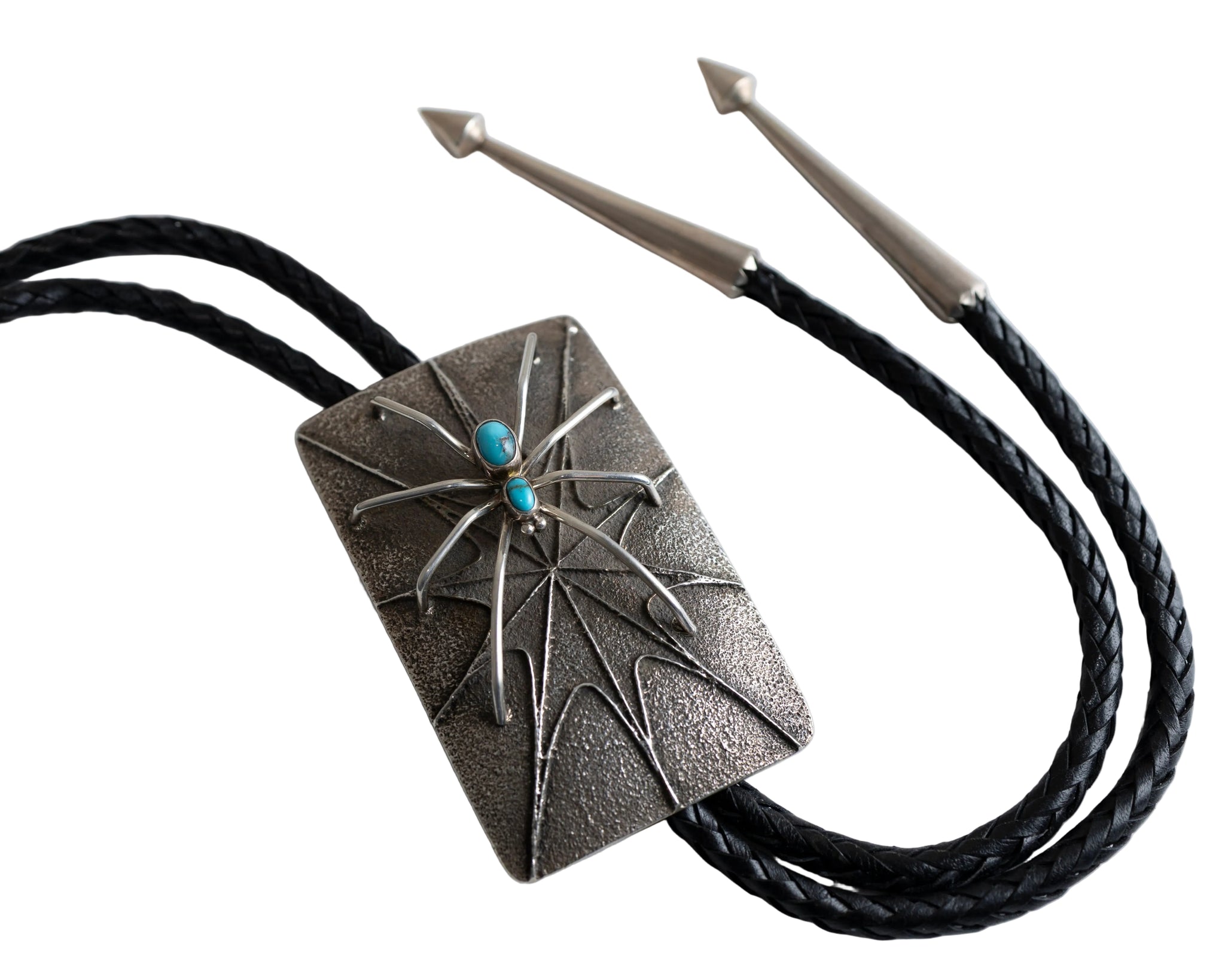 The focal point of this piece is a silver spider, a significant motif in Navajo culture. Spider imagery is often associated with Spider Woman (Na’ashjéʼíí Asdzáá), a revered cultural figure traditionally credited with teaching the Navajo people the art of weaving. Through this association, the spider is understood to symbolize creativity, patience, balance, and protection, as well as knowledge passed down through generations. Executed in silver using traditional methods, this design speaks to the strength and precision of Navajo silversmithing and represents a compelling addition to his Southwestern or Native American jewelry collection, whether worn or preserved as a collectible work.