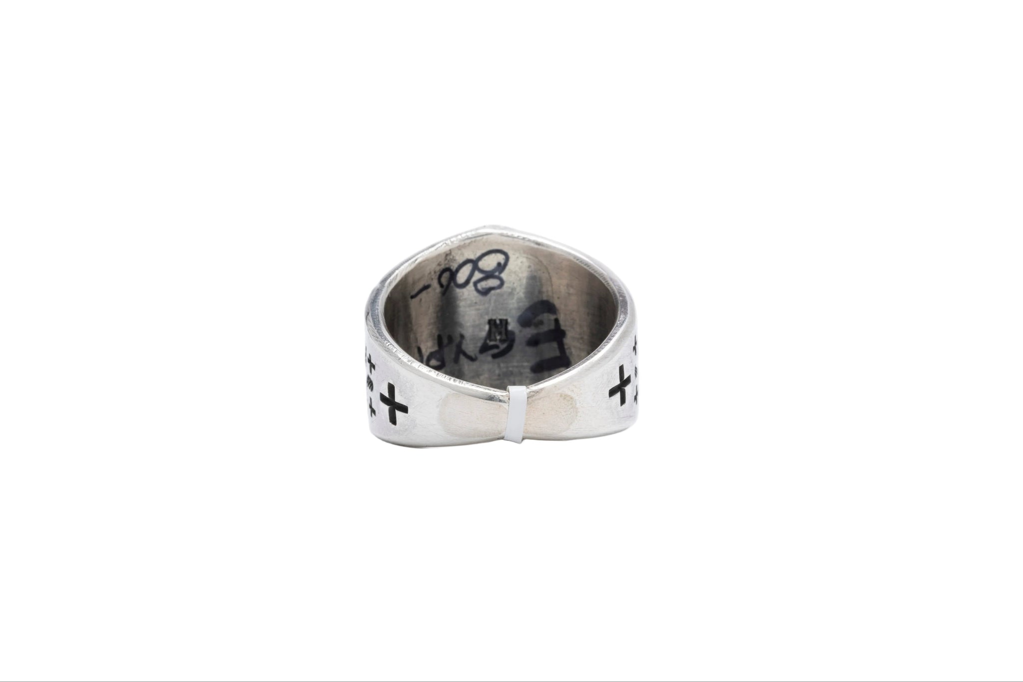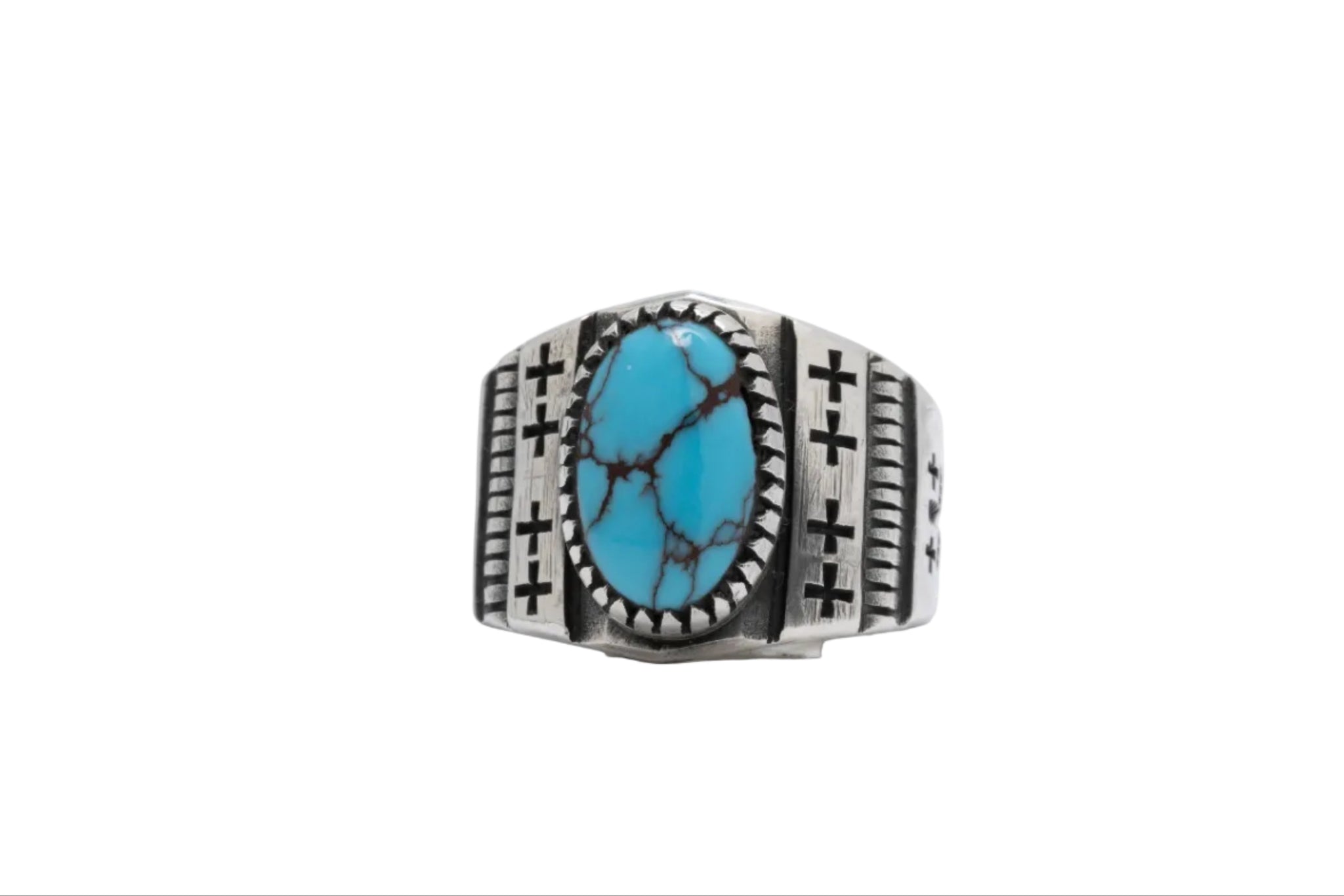 Coming from the Sinai Peninsula, Harrison Jim's ring design feature a stunning oval cut Egyptian turquoise at the center of this ring. He completes the silver ring with a matrix a crosses and patterns hand stamped into sterling silver creating a modern yet traditionally rooted design that is perfect for those looking for a ring that can be worn everyday around the Rez, or standout in the city while wearing silver and turquoise your ancestors told you to keep on you for protection.