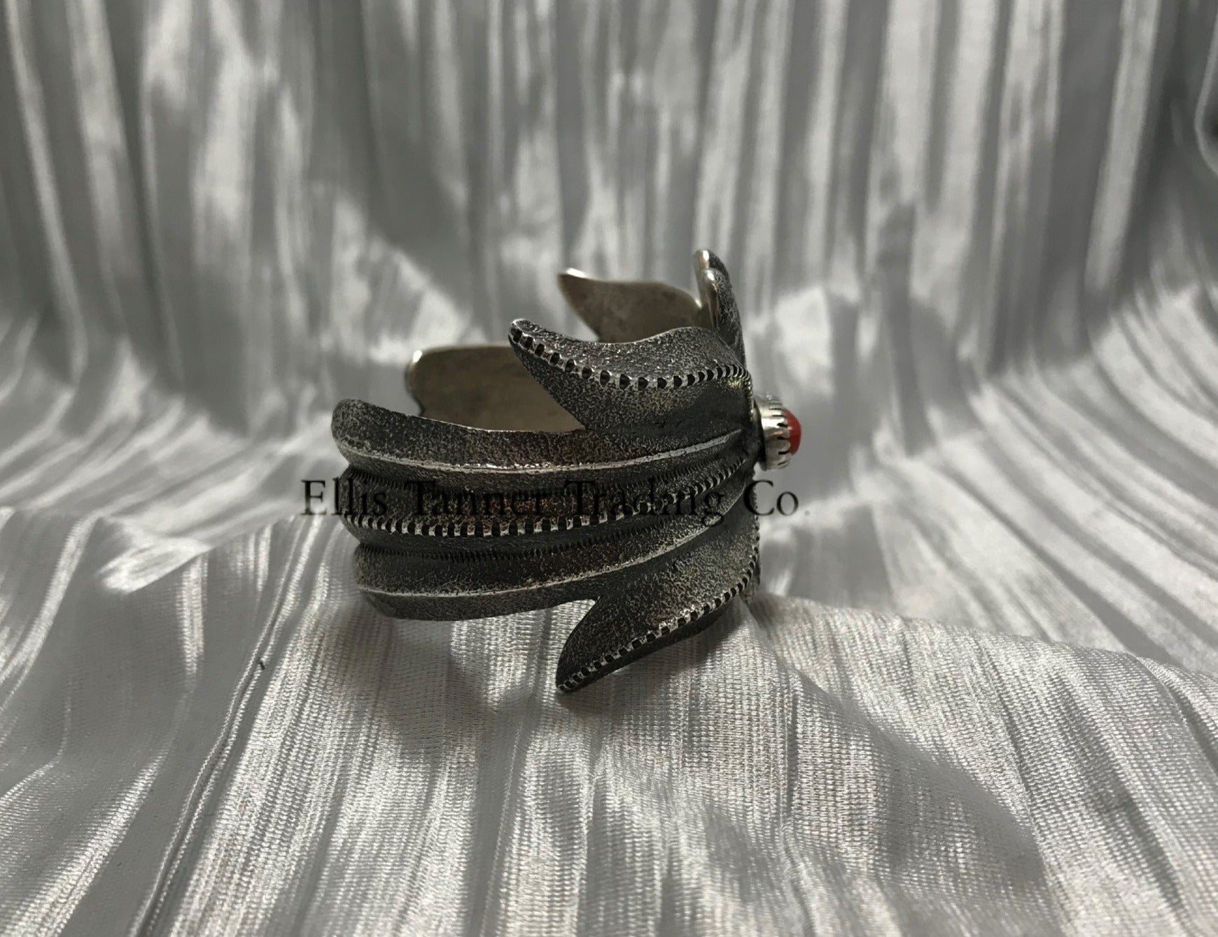 Elevate your style with the bold, one-of-a-kind coral Blooming Cuff by artist Harrison Jim. Hand crafted using sand casting techniques, every piece is unique and offers a touch of daring to any outfit. Made with coral stone and featuring a striking blooming design, this cuff is finished with an old-fashioned touch for a truly adventurous feel. Dare to be different with the Harrison Jim Blooming Cuff!