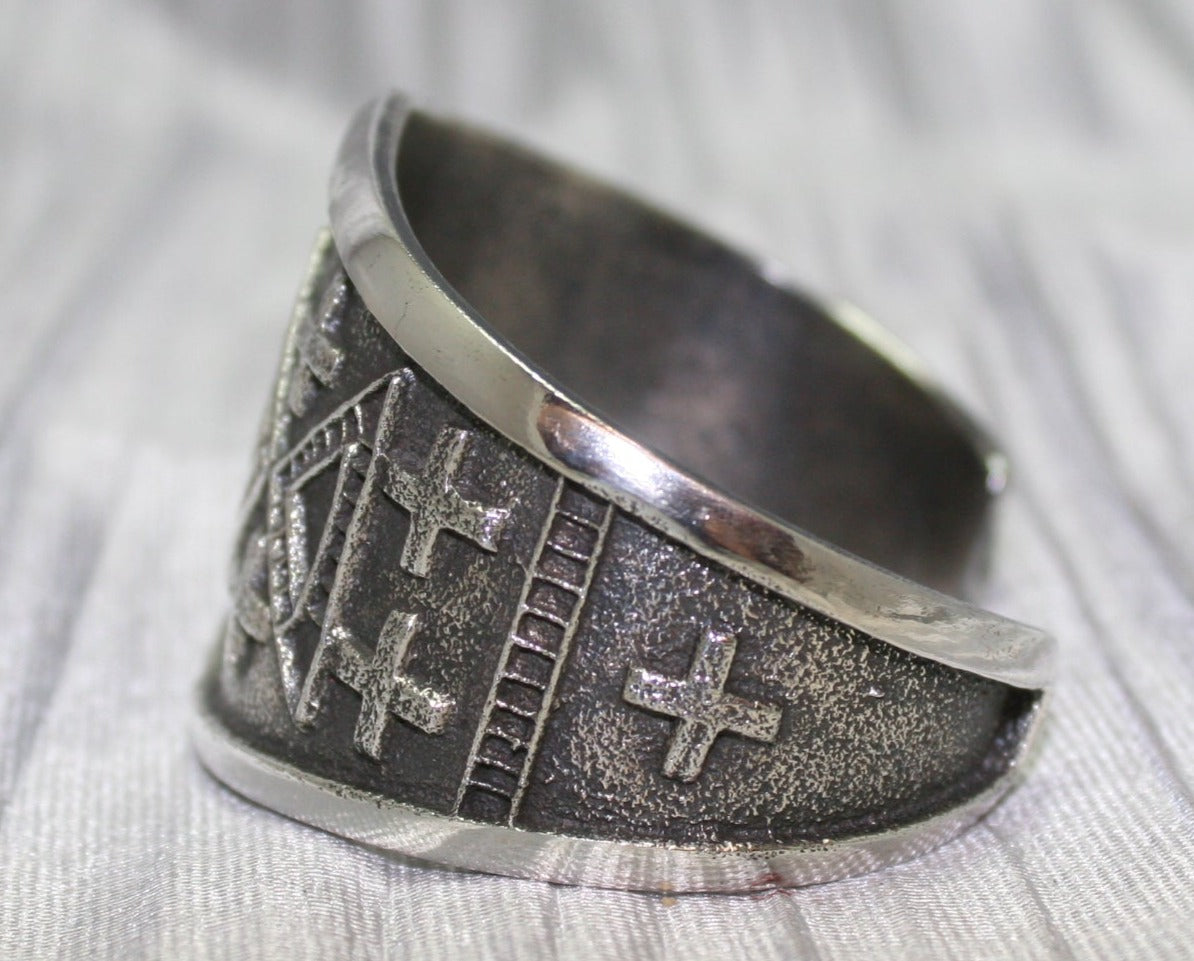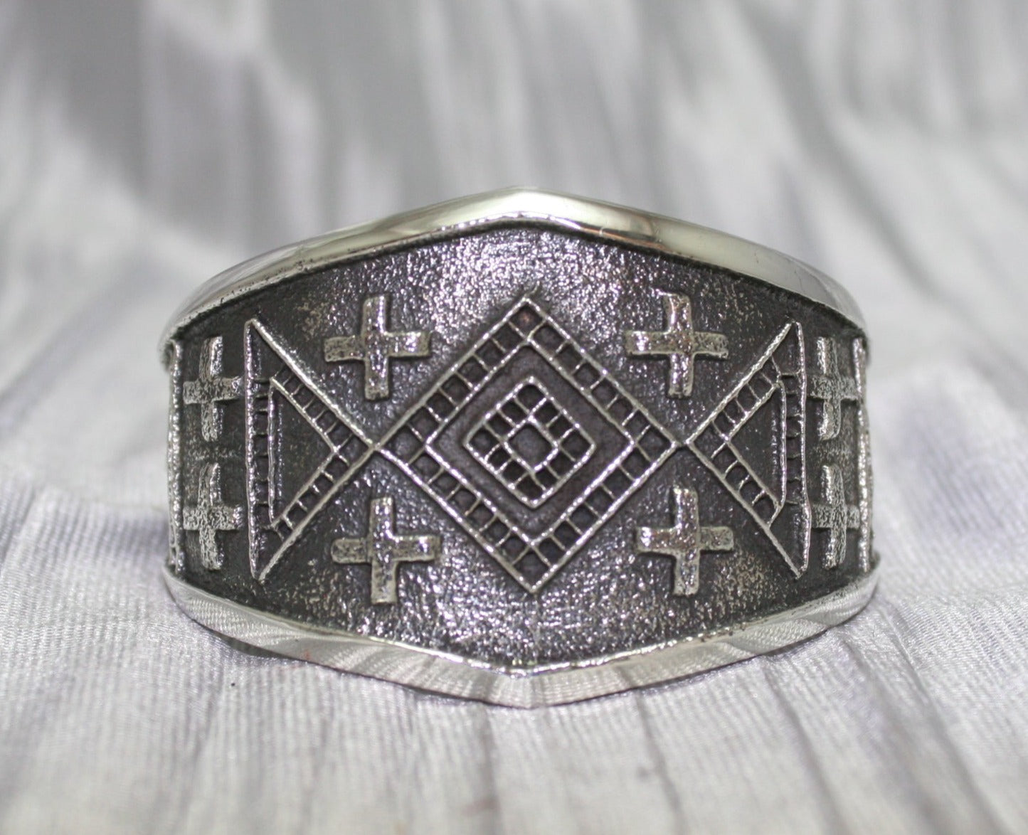 This handcrafted silver cuff is a true statement piece, showcasing intricate geometric and cross patterns that scream timeless elegance. The bold, symmetrical design is expertly etched into the textured silver, creating depth and contrast that highlights the artisan's exceptional skill.
