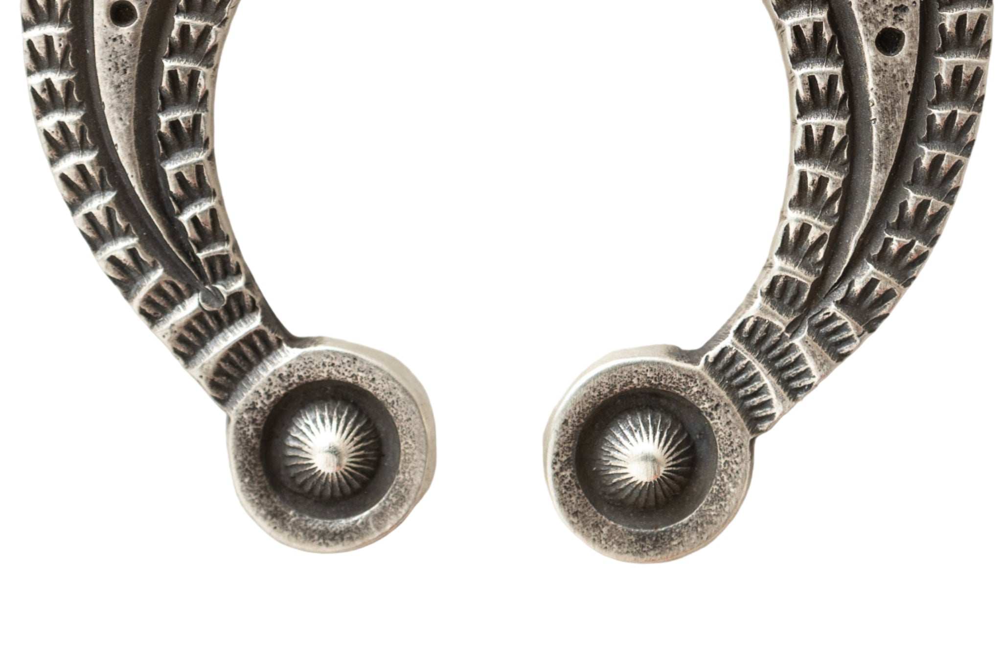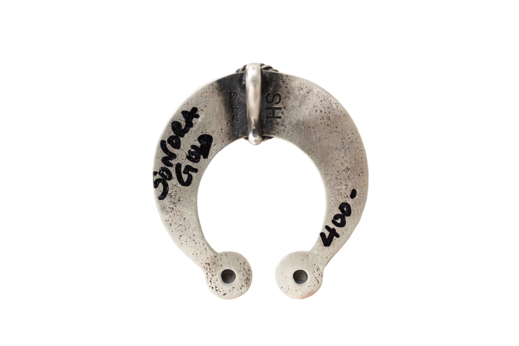 Handcrafted by Navajo silversmith Herman Smith, this Heavy Silver Naja Pendant features his signature heavy gauge silver work. The stunning Sonoran Gold Turquoise centerpiece adds unique southwestern distinction. Designed to be worn as both a pin and a pendant, this versatile Native American jewelry piece blends Navajo tradition with everyday practicality. It's a timeless accessory for those who appreciate authentic Native American creative artistry.
