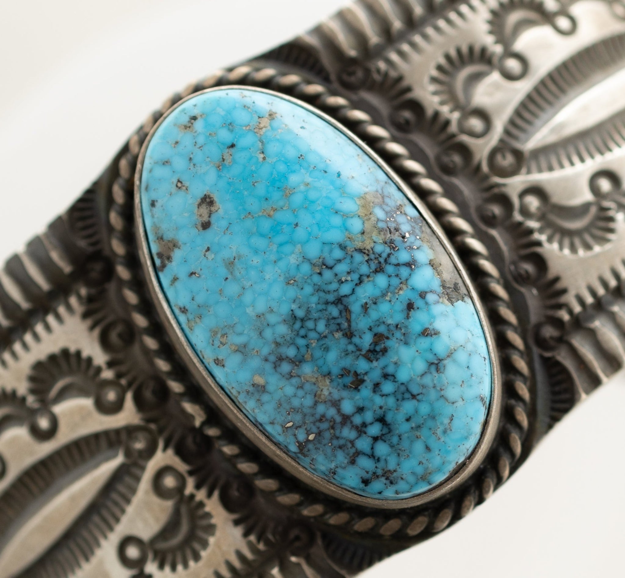 Discover the bold beauty of this Kingman Turquoise Slim Cuff by Navajo artist Herman Smith. Crafted from heavy gauge silver, this cuff is both sturdy and stylish. The striking Kingman Turquoise stone adds vibrant color, making it a perfect statement piece that highlights authentic Native American craftsmanship. Elevate your collection with this unique and timeless accessory.