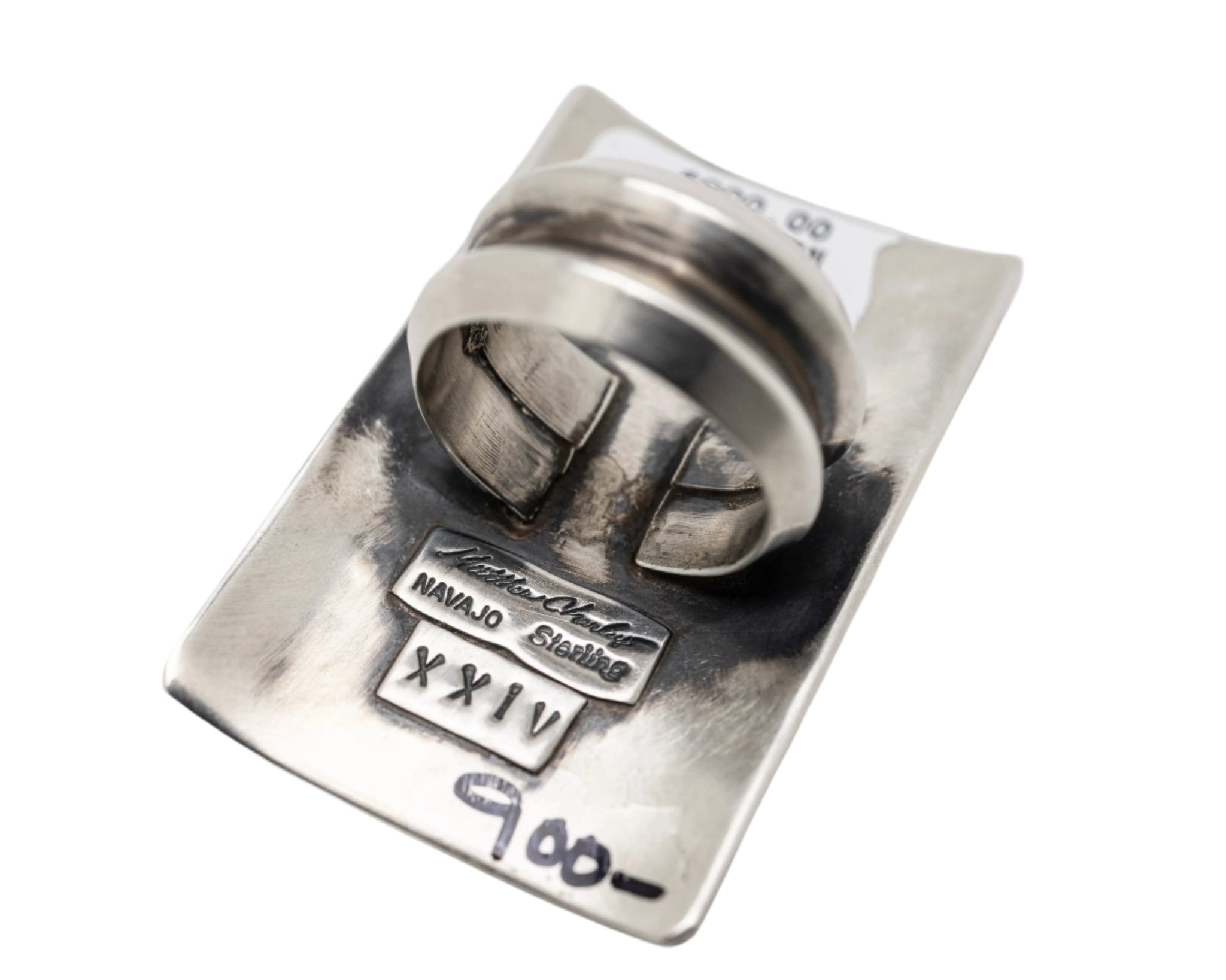 Crafted from sterling silver, this Matthew Charley (Navajo) Onyx Row Ring features a bold, thick band adorned with multiple rows of small onyx gemstones. As is common with Matthew Charley pieces, this ring design offers a sophisticated yet edgy look, perfect for adding a touch of refined style to any outfit. Durable and eye-catching, it’s an ideal accessory for those who appreciate timeless elegance with a modern Native American jewelry twist.