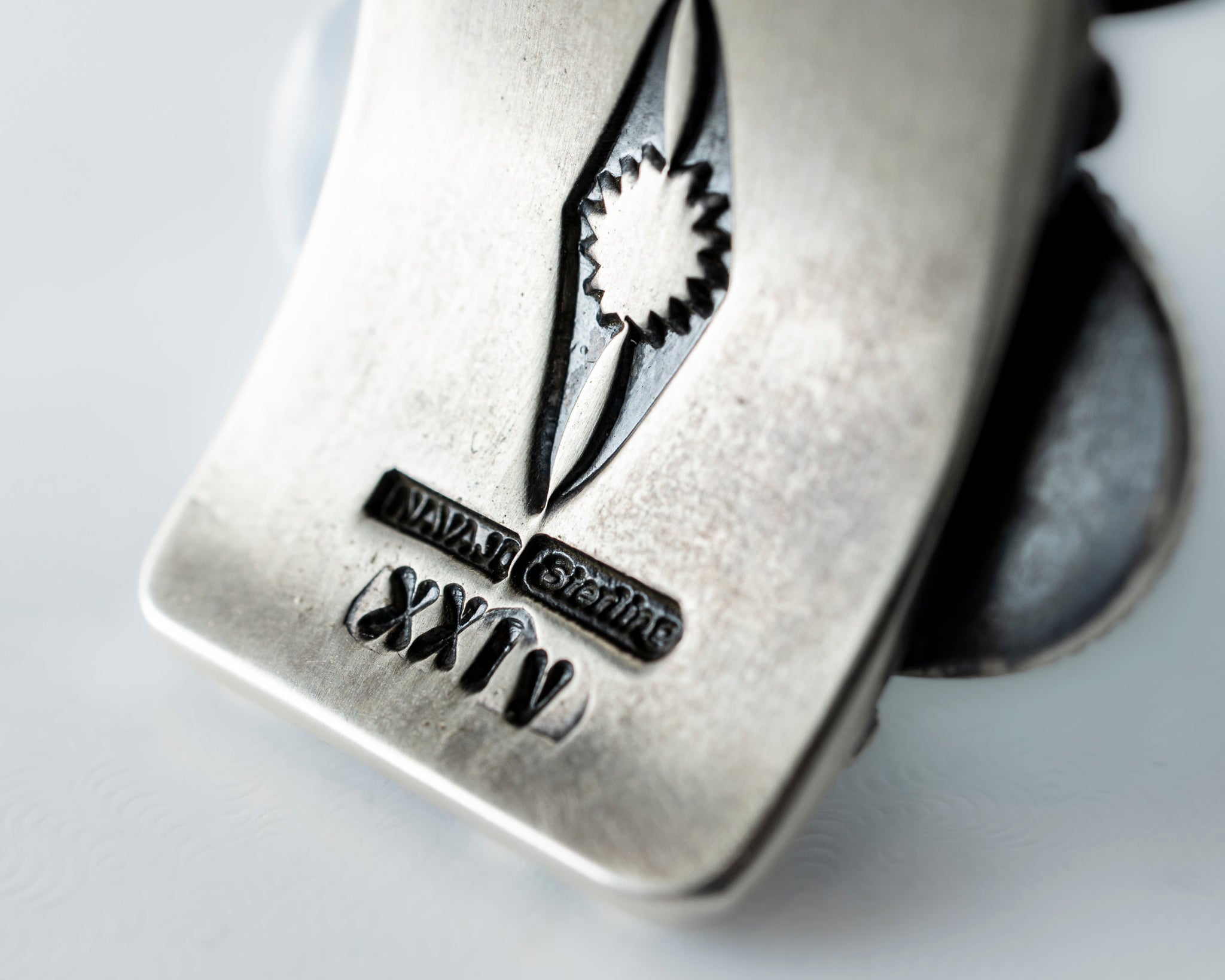 What really sets it apart is the hand-stamped work on the interior, Matthew takes the time to add those details even though they're hidden from view. That's the kind of work you get from a silversmith who cares about quality in every inch of his work. The oxidized silver finish gives it an authentic character and depth. With Matthew's hallmark and XXIV NAVAJO STERLING stamped, the oxidized finish gives the silver a worn-in, honest look, like it’s already been places and is ready to go to a few more!