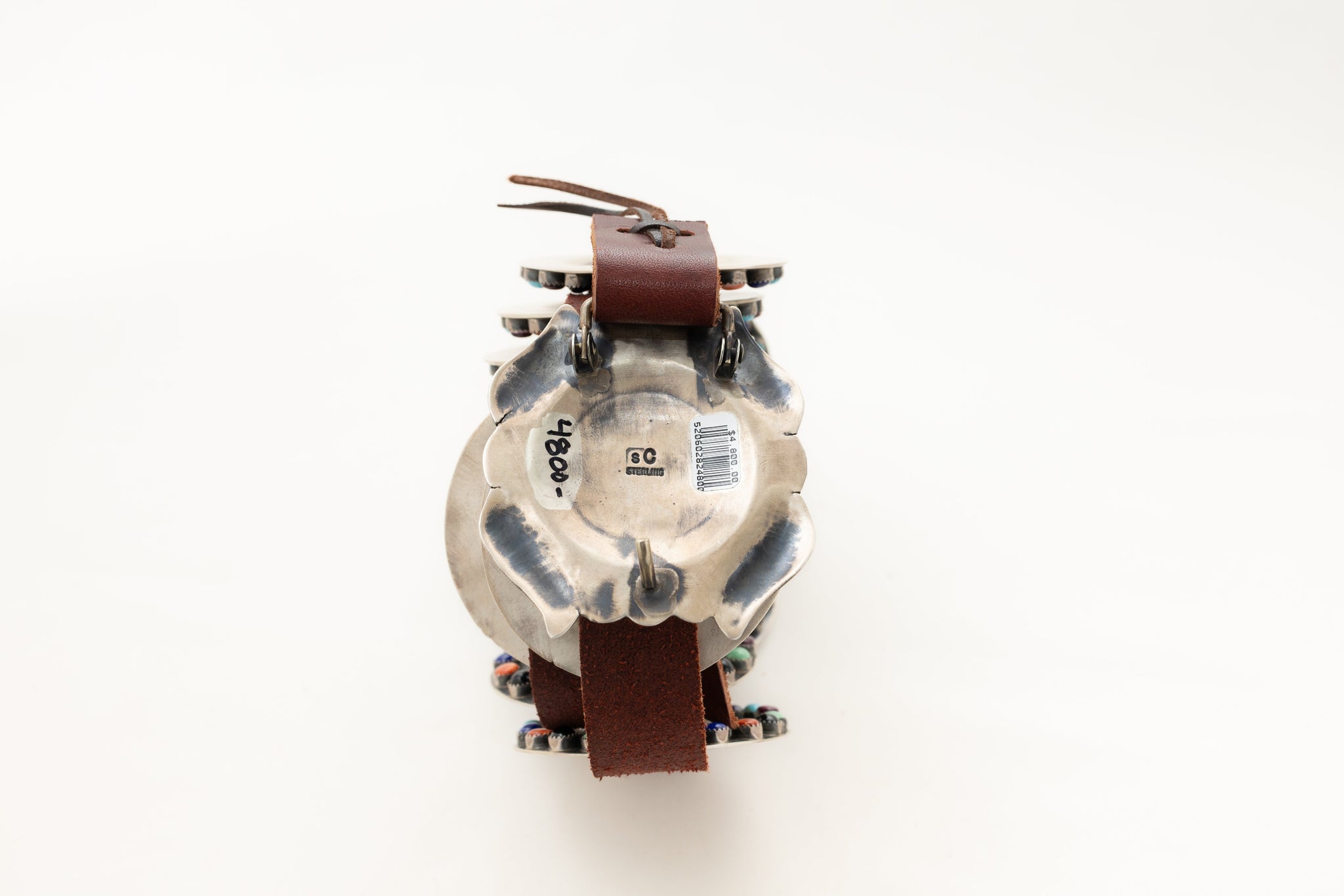 This sterling silver concho belt showcases the skilled craftsmanship of Navajo silversmiths from Gallup, New Mexico. Hand-stamped conchos set with genuine turquoise, coral, lapis, and onyx stones rest on a soft brown leather strap, blending tradition with natural beauty. The oxidized silver highlights intricate details, giving the belt a rich, authentic character. Perfect for those who appreciate genuine Southwestern art, this belt adds timeless charm and heritage to any collection.