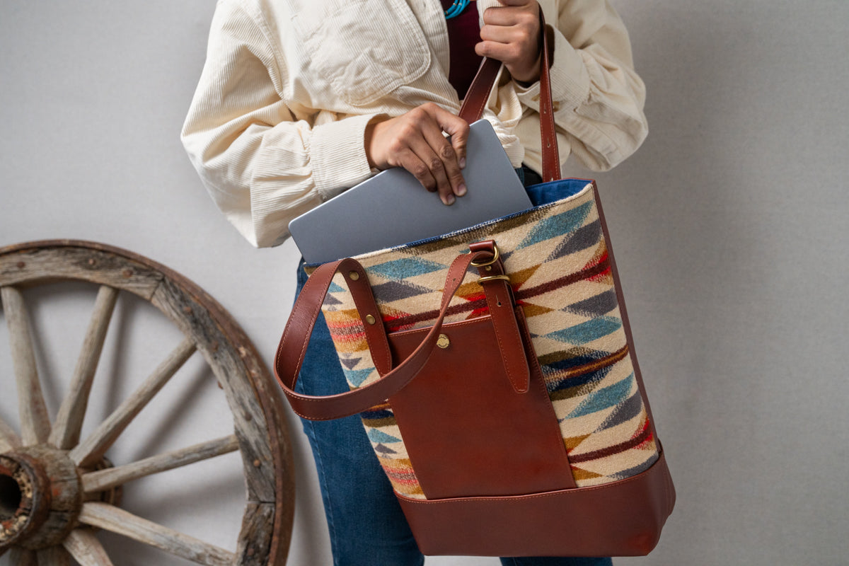 From our premium wool and leather collection, this open-top tote blends function with classic Pendleton style. Crafted from full-grain leather with a front panel of USA-woven wool in our Wyeth Trail pattern, this carry-all bag features sturdy adjustable leather handles, a reinforced base, and a spacious cotton-lined interior. One exterior snap close leather slip pocket and one deep zippered interior pocket. A timeless companion for errands, travel, or everyday carry.