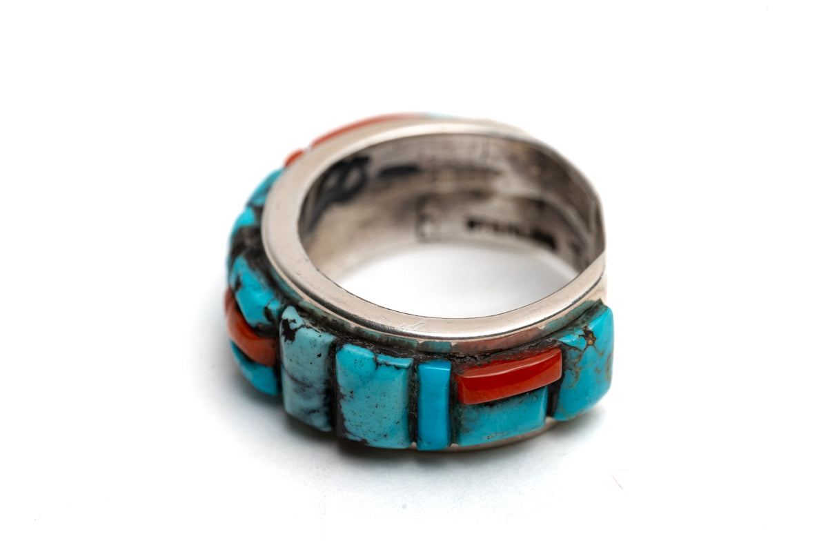 Ervin P. Tsosie is known for his intricate channel inlays. But this ring has a staggering but welcomed twist compare to his usual inlay style! With this ring, Tsosie does a cobble inlay on a 3/8" silver band, featuring coral and Kingman Turquoise gemstones.