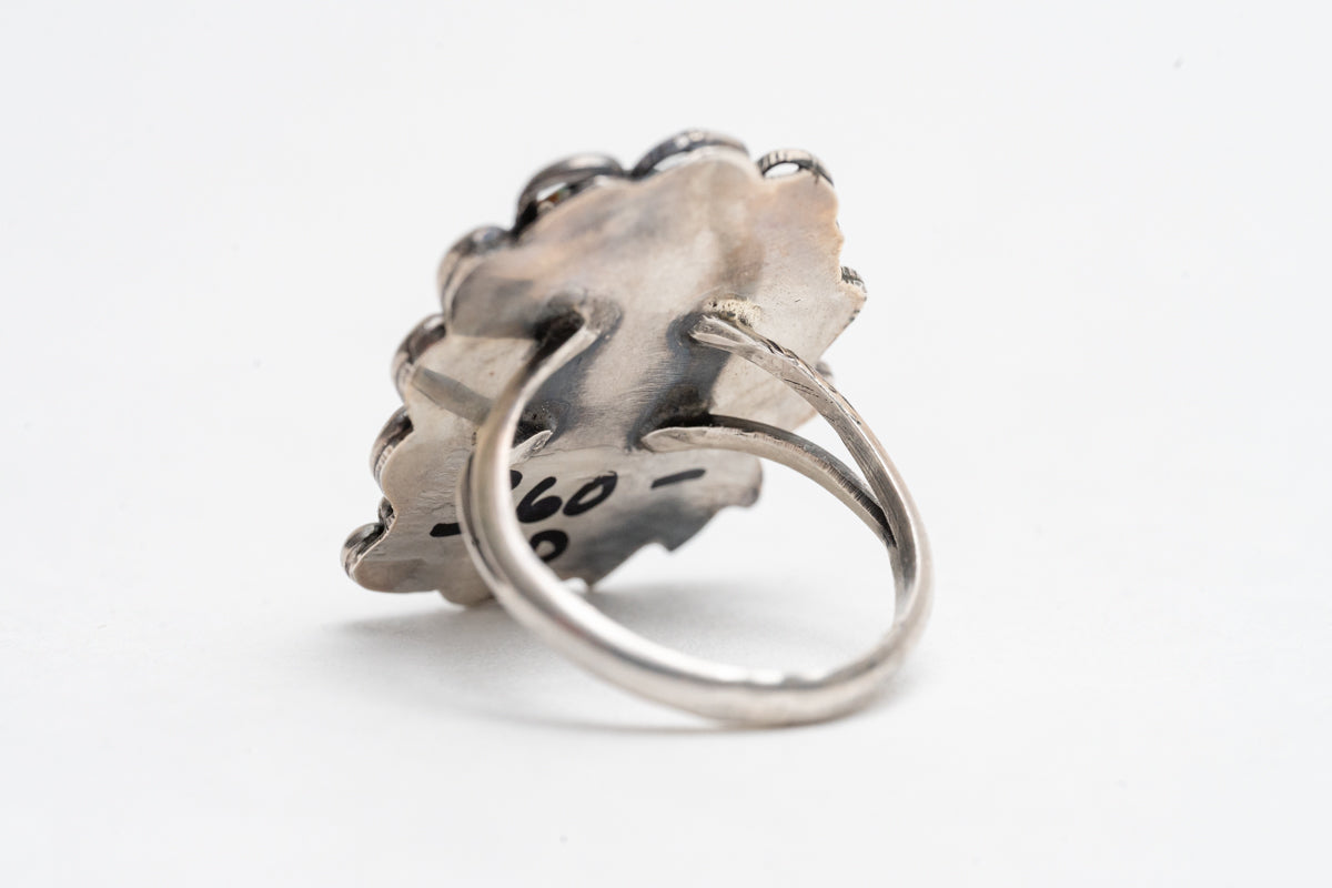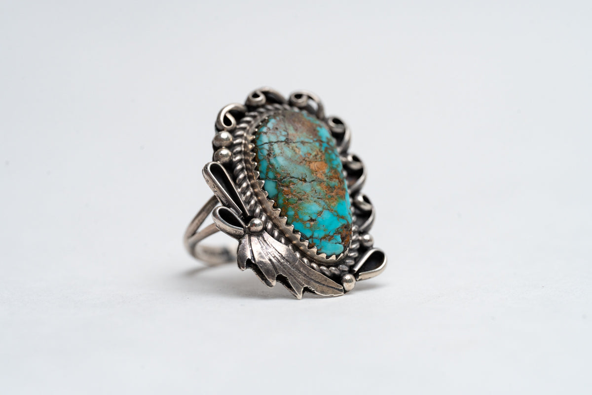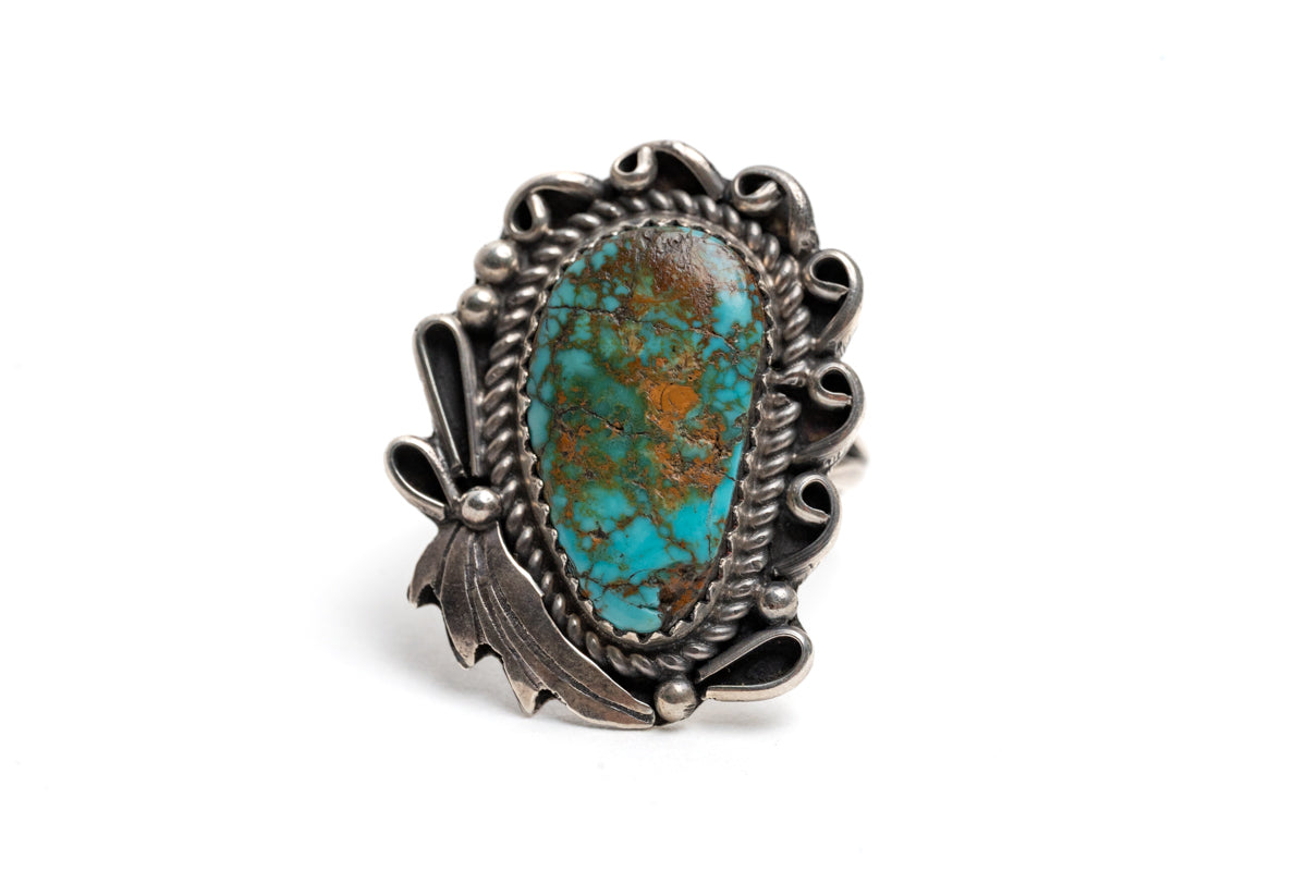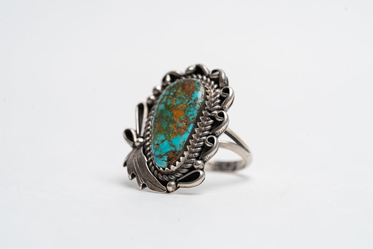 A genuine Native American jewelry piece from our vintage collection, this Navajo silver ring features a beautiful Royston Turquoise stone cradled in hand-worked silver shaped like a leaf. You'll find the "AG" hallmark stamped inside, marking its authenticity. It's the kind of Native American turquoise ring that tells a story - the sort of treasure you'd expect to discover in a local antique shop, carrying real history and character that mass-produced pieces simply can't match.