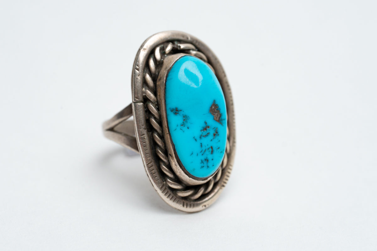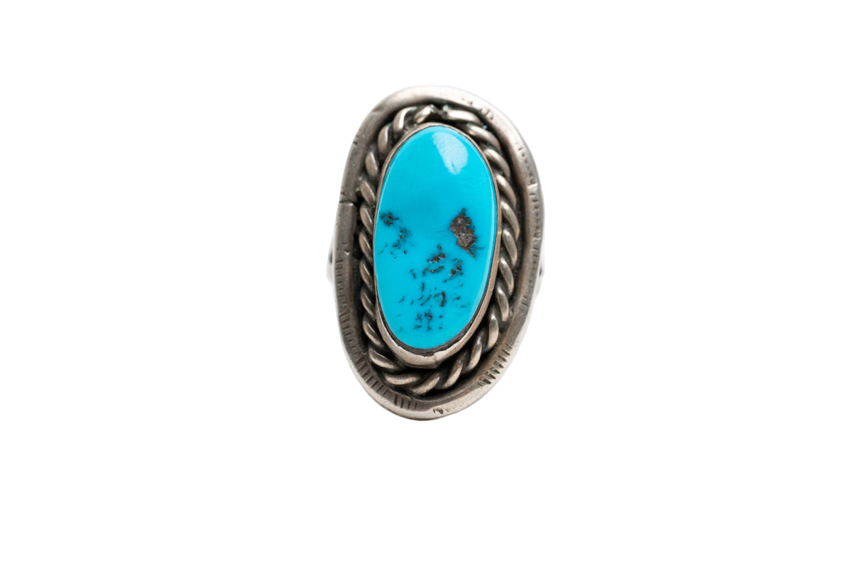 This vintage Single Turquoise Ring features a beautifully aged Sleeping Beauty turquoise stone, carefully set in a classic silver wire twist bezel. Perfect for everyday wear, its timeless design from the middle section of the band offers both comfort and character. A subtle yet striking piece that adds a touch of southwestern charm to any outfit.