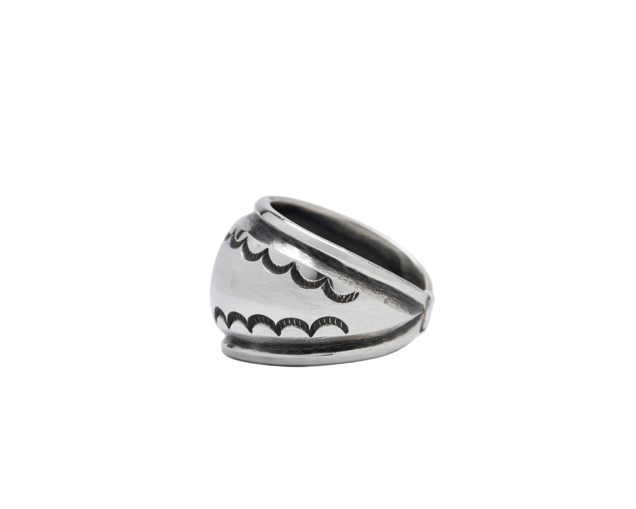 This sterling silver ring comes from Harrison Jim, a skilled Navajo silversmith we're proud to work with in Gallup, New Mexico. Handmade with solid construction and substantial feel, it features clean, purposeful design that lets the silver do the talking. No stones required when you've got this kind of craftsmanship. The blown-out detailing and hand-stamped moon motifs running around the band showcases the kind of quality work that is made for an everyday wear!