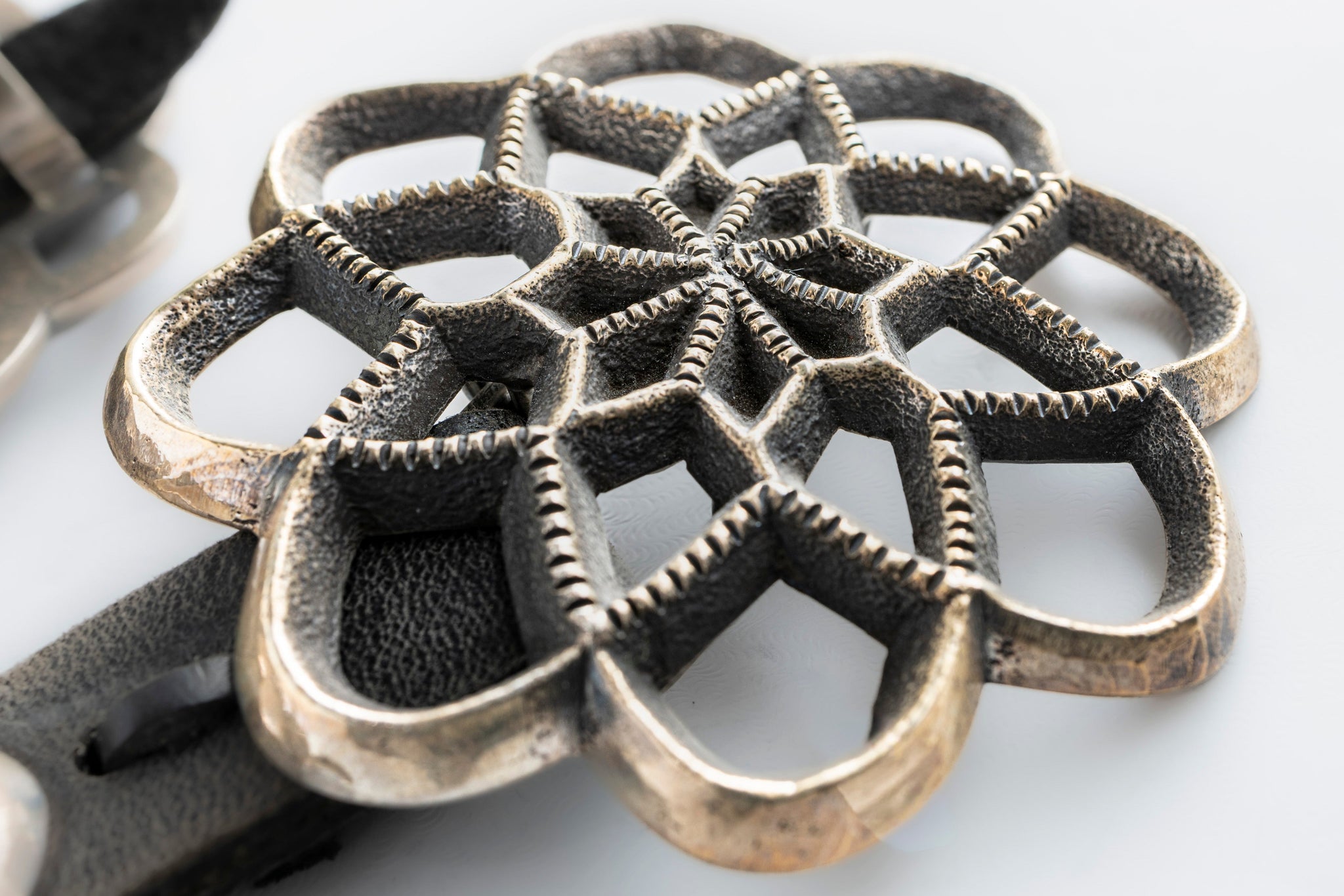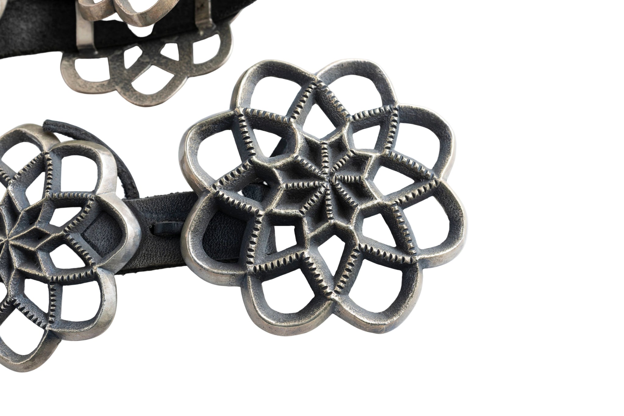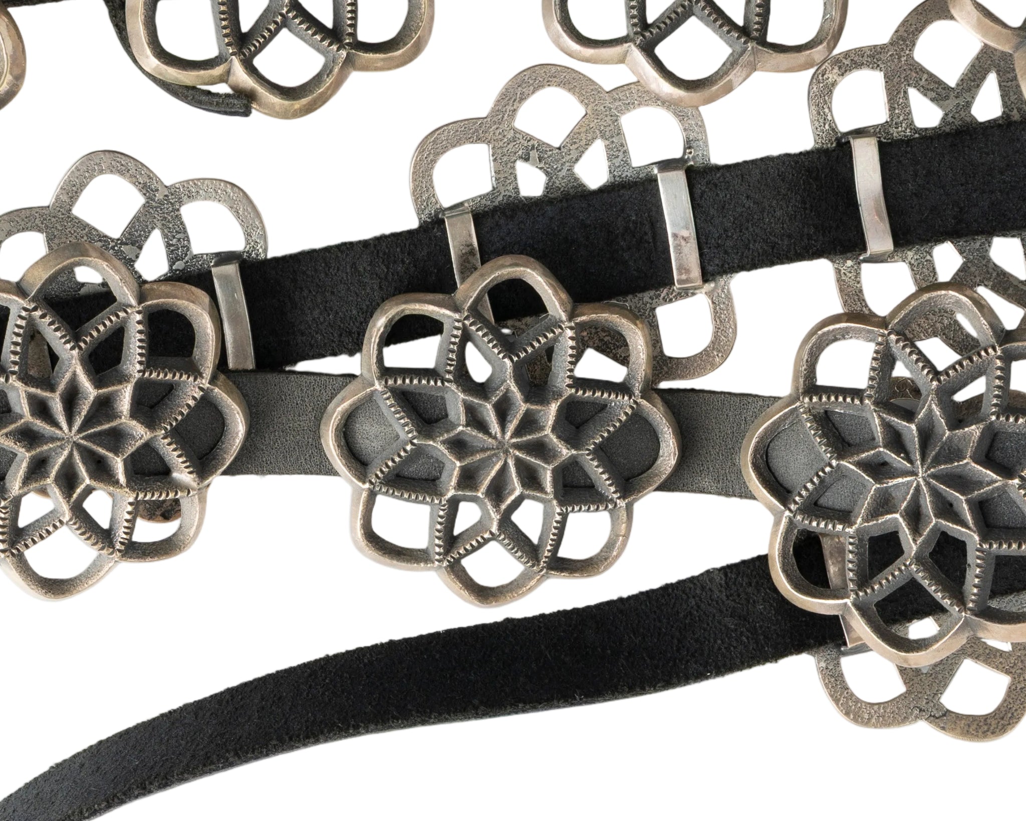 Every concho shows the steady hand of Harrison Jim, a respected Navajo silversmith known for clean, traditional work that doesn’t chase trends. The oxidation settles into the details, while the raised silver edges catch the light just enough to bring the pattern forward.