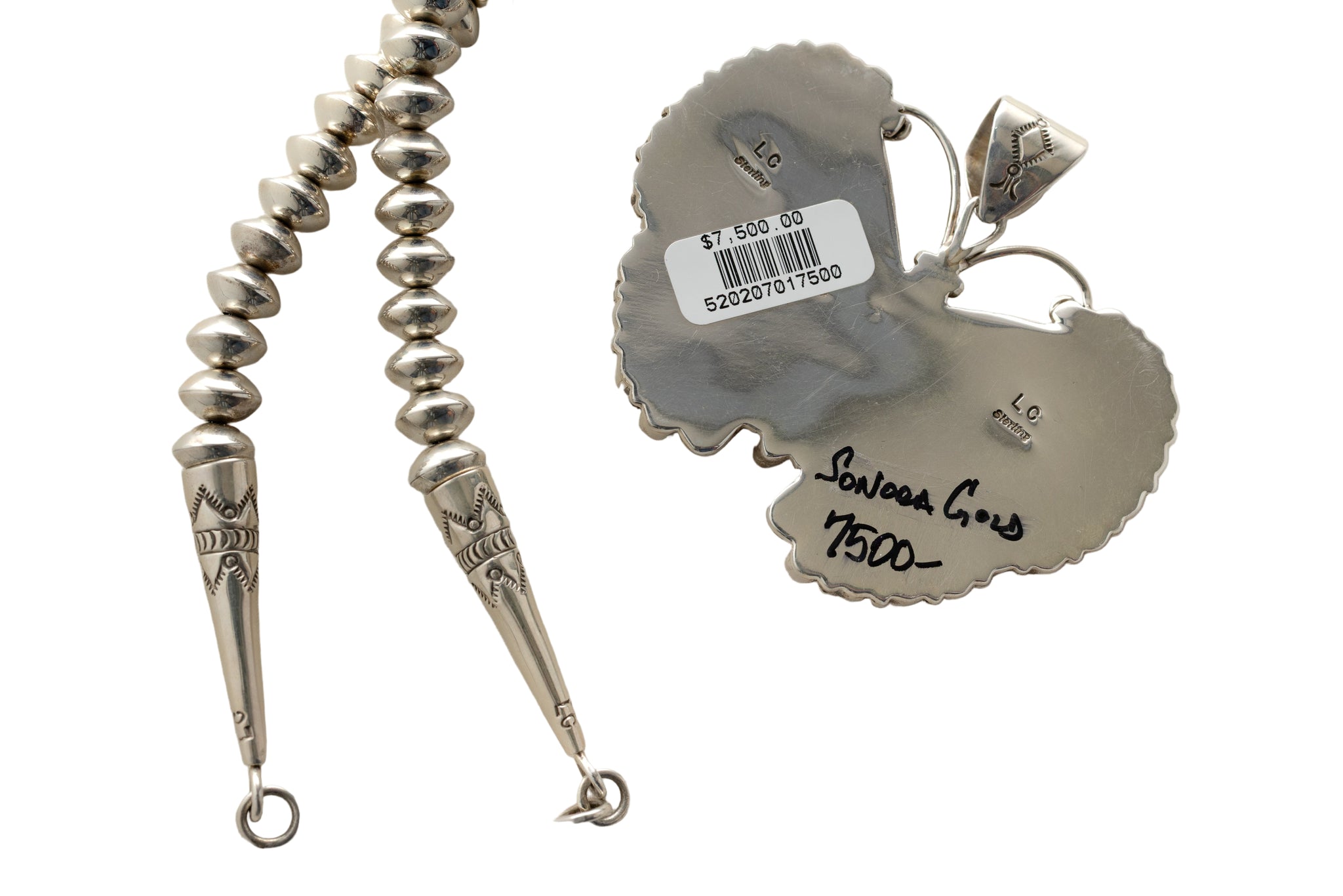 Handcrafted by Dine artist Lee Charley, this silver bead necklace features a stunning butterfly-shaped pendant inlaid with genuine Sonoran Gold Turquoise and tiny circle Spinney Oyster stones. The intricate craftsmanship and natural materials create a piece that combines cultural tradition with elegant style. Perfect for adding a unique touch to your jewelry collection or gifting someone special, this necklace brings the warmth and authenticity of small-town artistry to your everyday look.