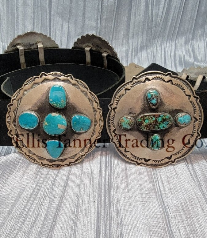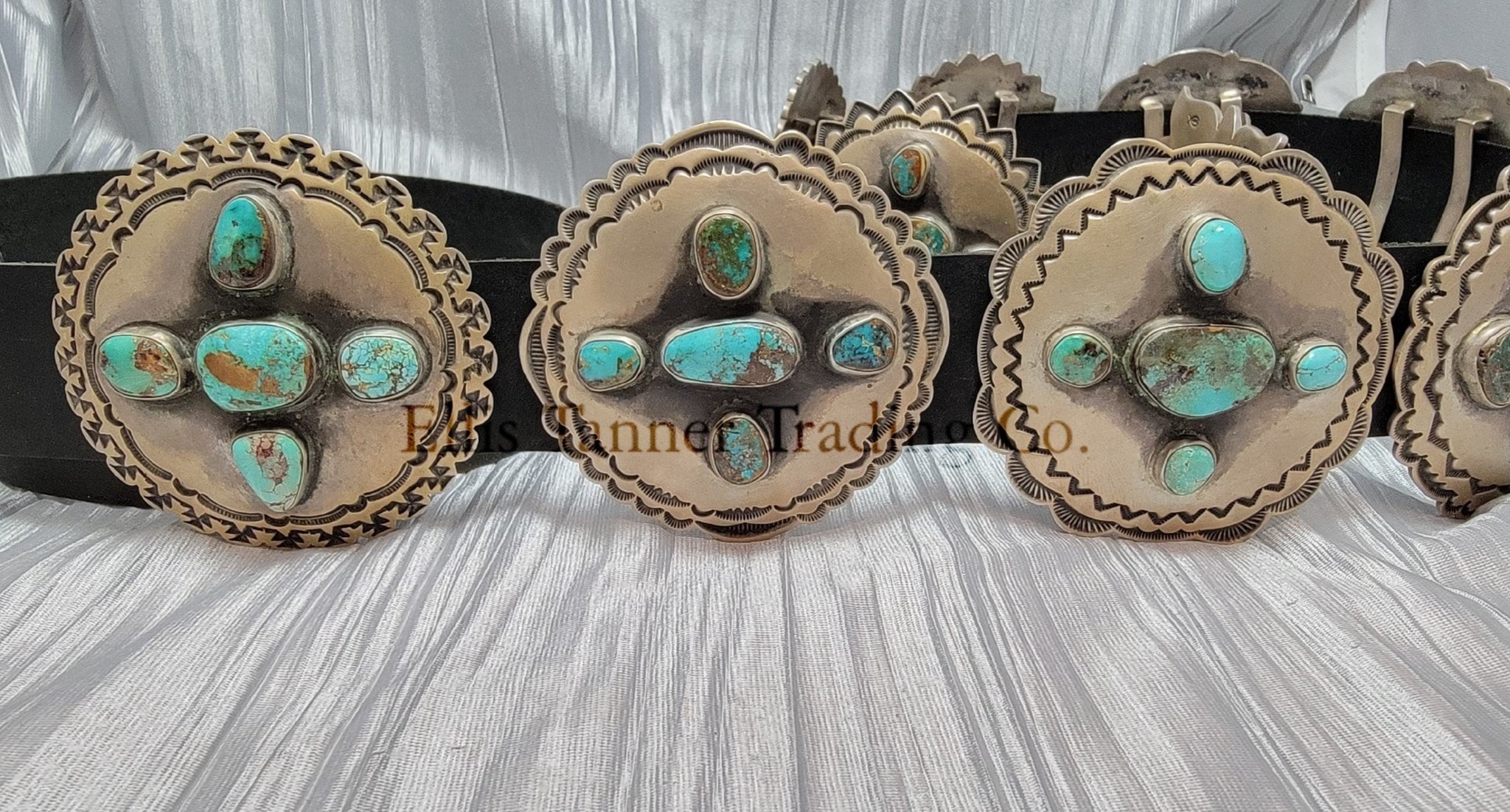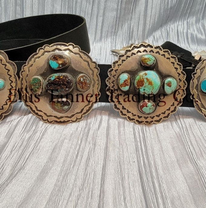 This is a handcrafted Navajo concho belt featuring a series of intricately detailed sterling silver conchos adorned with mixed turquoise stones. The design showcases vibrant turquoise shades and natural matrix patterns, set against finely engraved silver motifs. The belt is attached to a high-quality leather strap, emphasizing its traditional and timeless aesthetic.